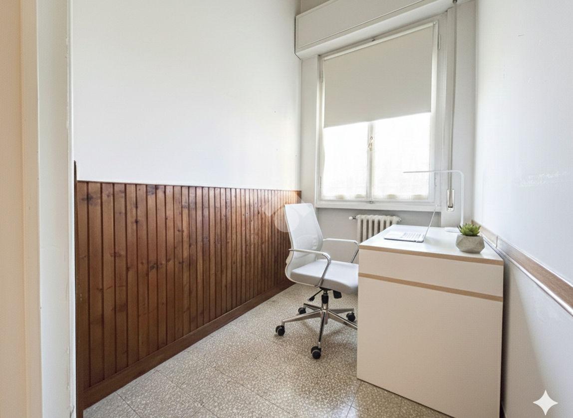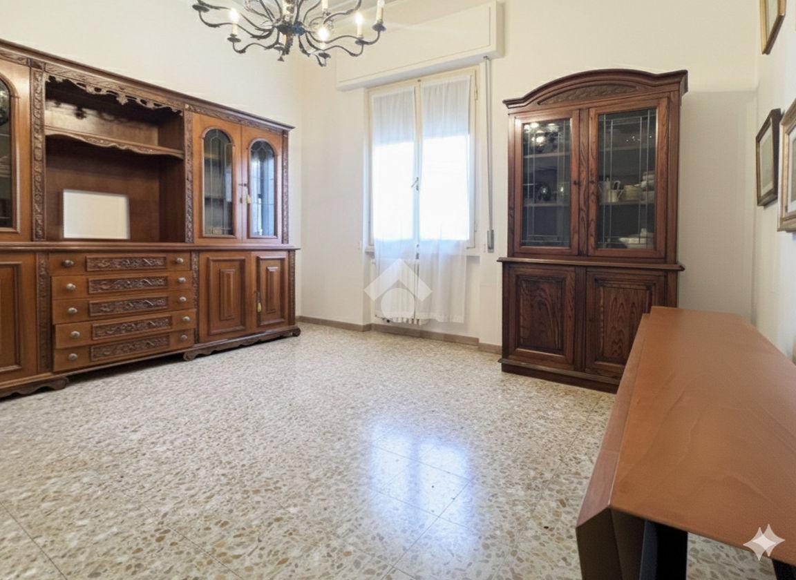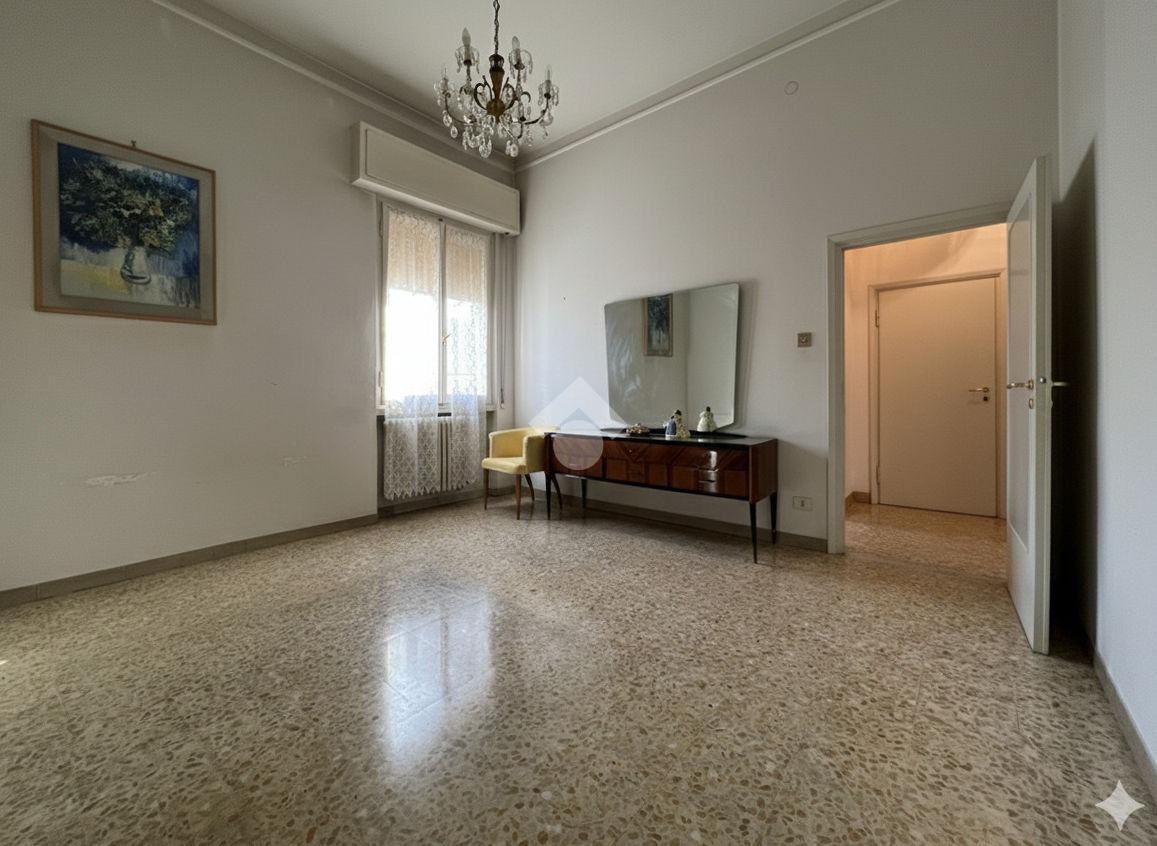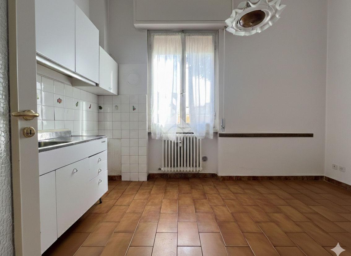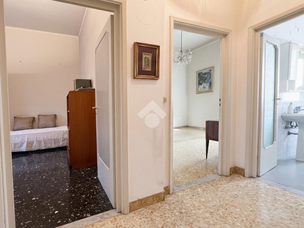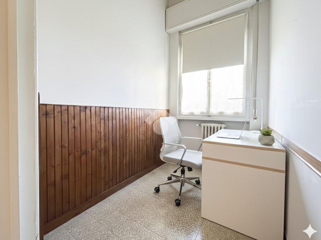 Al piano terra rialzato di stabile anni 60: Cinque locali di 96 mq commerciali, in ingresso troviamo la funzionale zona giorno composta da cucina con ripostiglio/lavanderia e soggiorno. Tramite disimpegno si accede al reparto notte, composto da due camere matrimoniali di cui una provvista di balcone, uno studio e un comodo bagno finestrato. All'interno della proprietà condominiale è presente un box auto di 14 mq di proprietà esclusiva e una cantina di 11 mq al piano seminterrato. All'interno del piazzale condominiale vi è possibilità di parcheggiare ulteriori auto.
