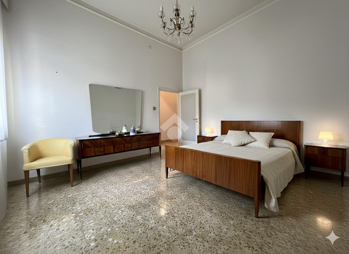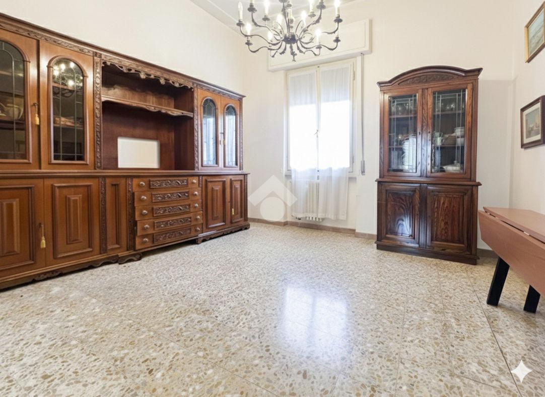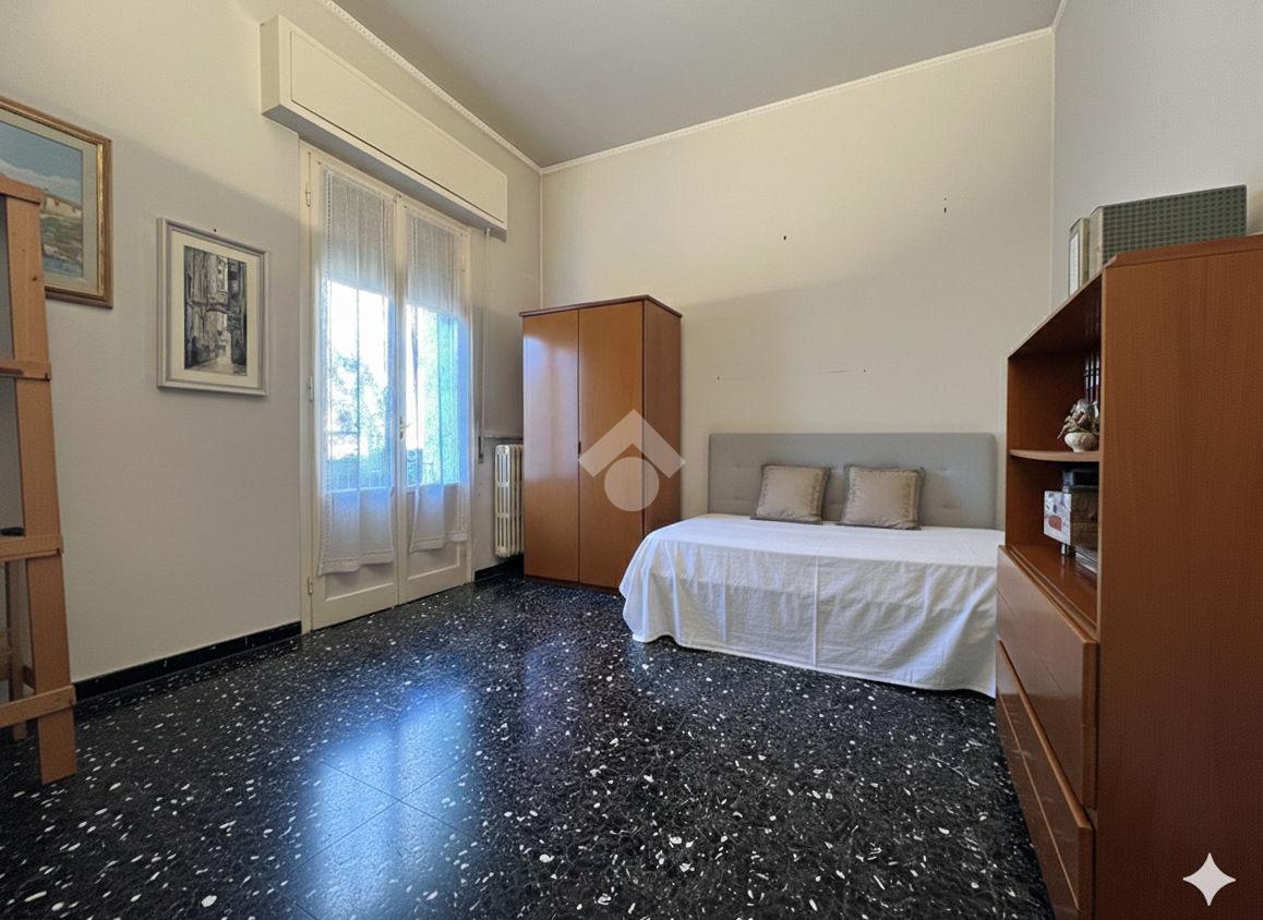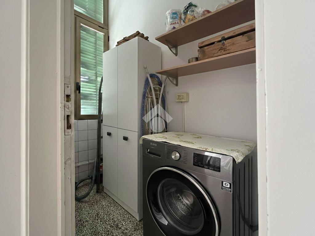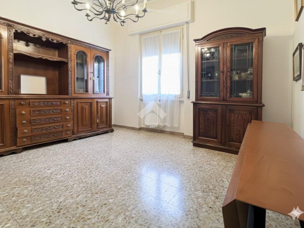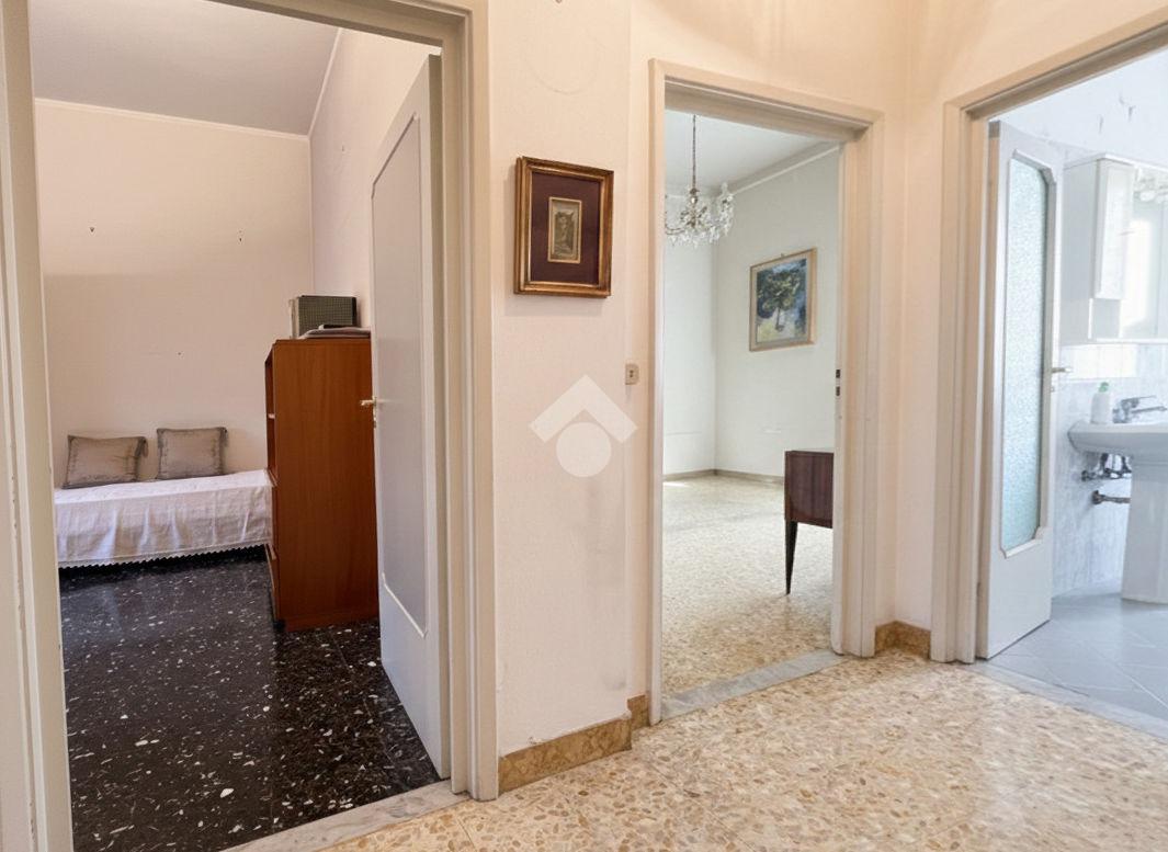 Al piano terra rialzato di stabile anni 60: Cinque locali di 96 mq commerciali, in ingresso troviamo la funzionale zona giorno composta da cucina con ripostiglio/lavanderia e soggiorno. Tramite disimpegno si accede al reparto notte, composto da due camere matrimoniali di cui una provvista di balcone, uno studio e un comodo bagno finestrato. All'interno della proprietà condominiale è presente un box auto di 14 mq di proprietà esclusiva e una cantina di 11 mq al piano seminterrato. All'interno del piazzale condominiale vi è possibilità di parcheggiare ulteriori auto.
