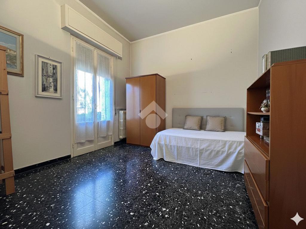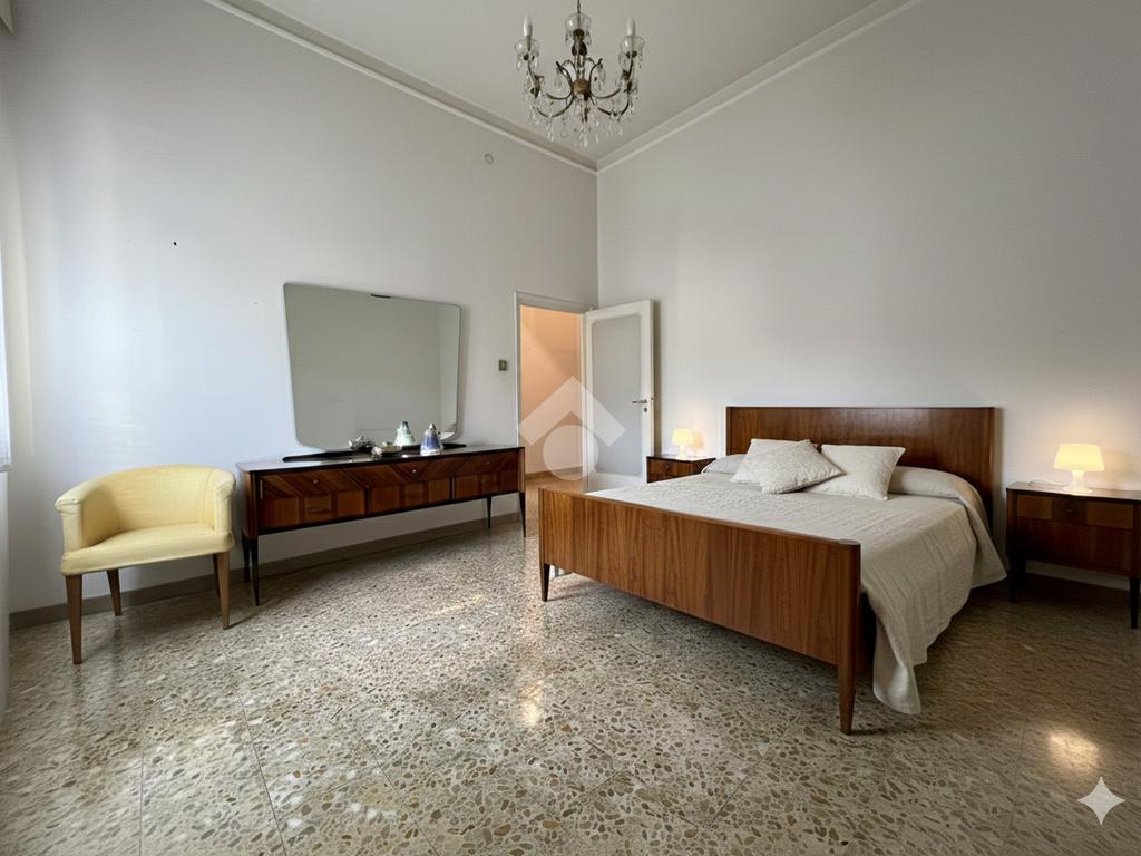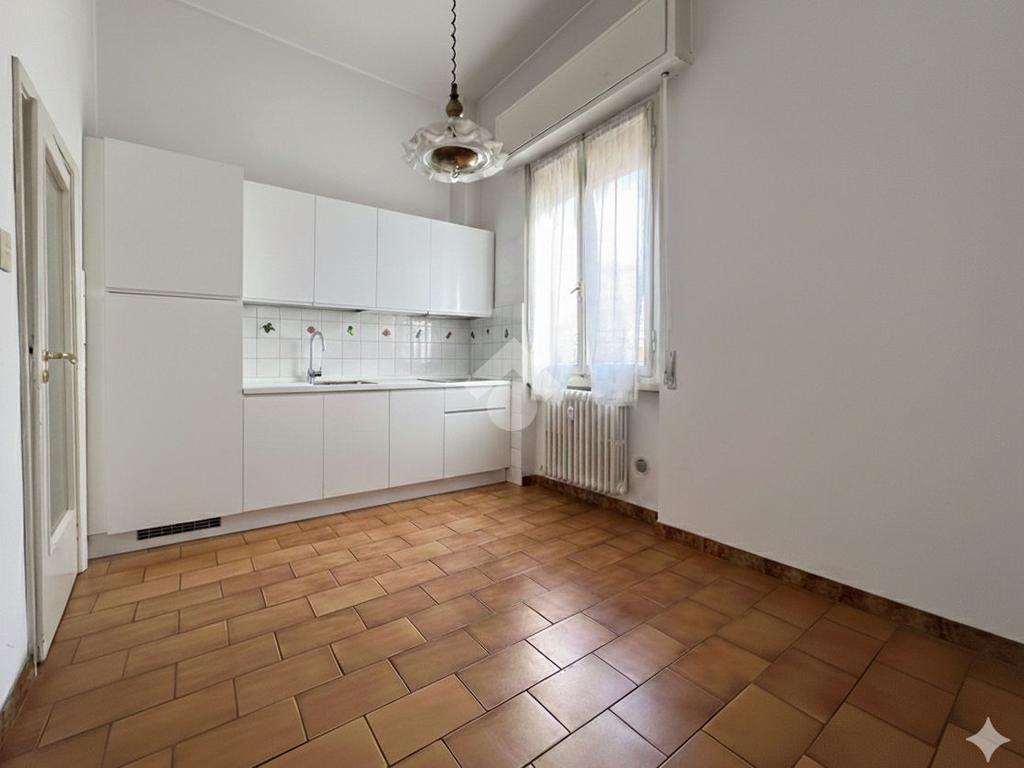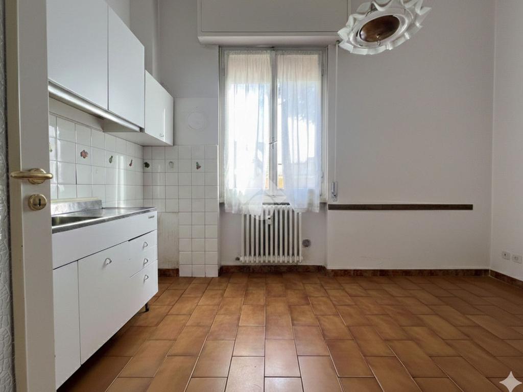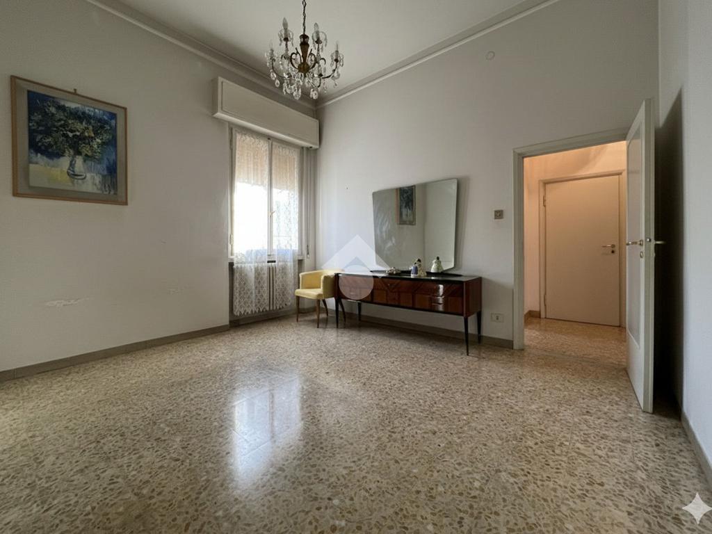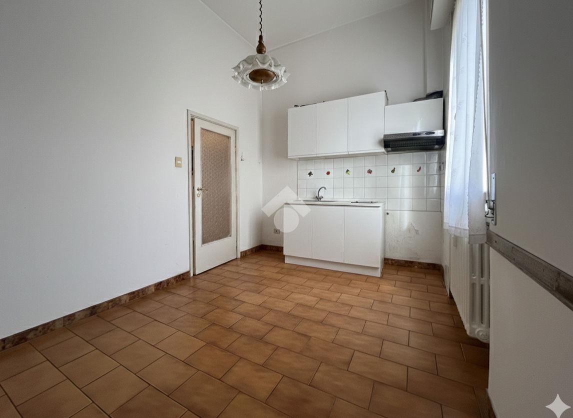 Al piano terra rialzato di stabile anni 60: Cinque locali di 96 mq commerciali, in ingresso troviamo la funzionale zona giorno composta da cucina con ripostiglio/lavanderia e soggiorno. Tramite disimpegno si accede al reparto notte, composto da due camere matrimoniali di cui una provvista di balcone, uno studio e un comodo bagno finestrato. All'interno della proprietà condominiale è presente un box auto di 14 mq di proprietà esclusiva e una cantina di 11 mq al piano seminterrato. All'interno del piazzale condominiale vi è possibilità di parcheggiare ulteriori auto.